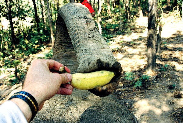 When you are riding on the back of a couple ton elephant, and it wants a snack, you do not fool around. You do not throw it and have him chase after it, you dont’ switch it from hand-to-hand, no you just offer. On an adventure out in the country close to Chiang Mai, Thailand, they gave me a batch of bananas to start with, but my ride quickly dispatched it. As soon as I was out ,the trunk came back anyway. Fortunately, they had a stand with a lady in it selling bananas and singha. After a pit stop there, we were both happy.
