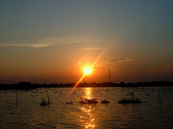 The backpacker district in Phnom Penh, Cambodia is centered around several guesthouses along Boeung Kok Lake. One must do attraction is taking a boat cruise around the lake as night falls to see the sunset. A fantastic way to end the day is drinking a cold Angkor beer while cruising around the lake in a boat meeting travelers from around the world.