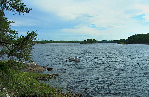 In this picture, I am canoeing away from our campsite in Lake Kawnipi, in search of smallmouth bass, walleye, or a northern pike. I caught a couple of northern pike for a wonderful fresh fish dinner.