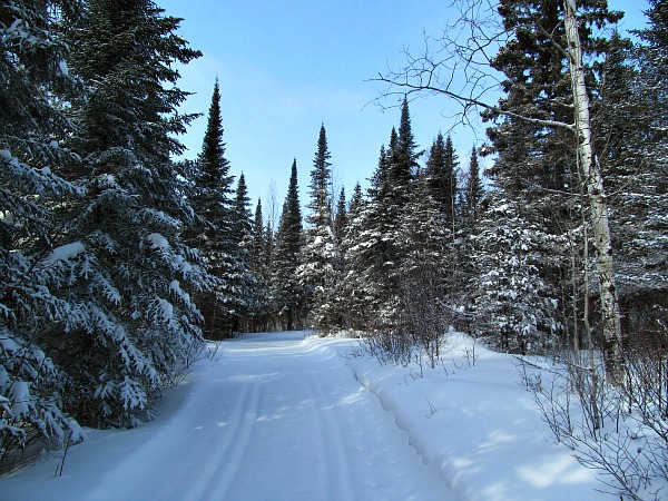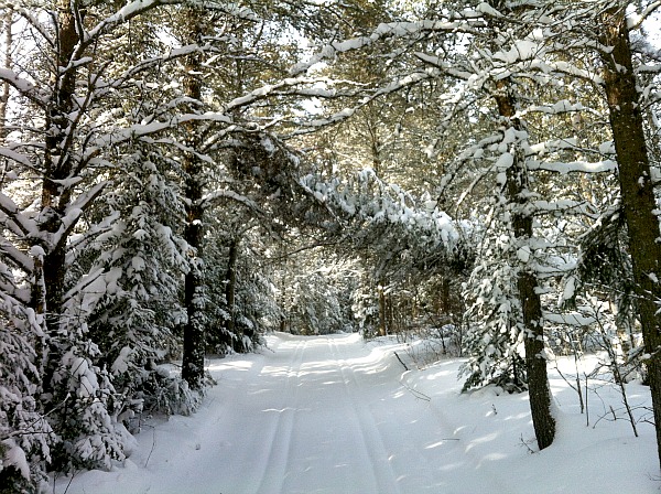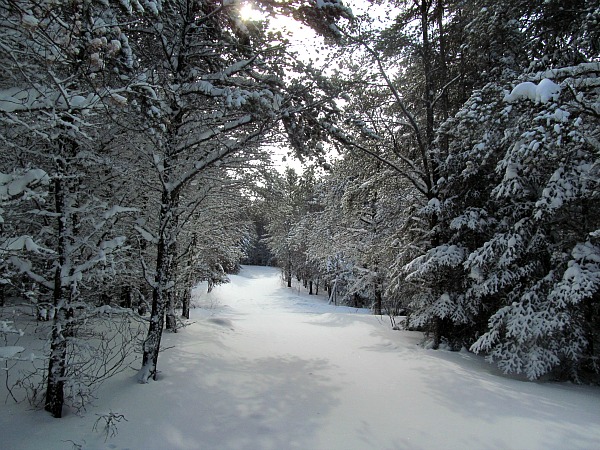Once the trail junction for Ham Lake was met, the trail darted into thicker woods providing protection. It had snowed the previous two nights, so a foot of fresh powder covered the woods and the trails. There were sections where pine trees on both sides made a beautiful snowy pine tunnel to ski through.