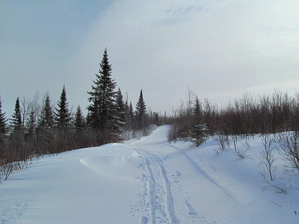 It was a crisp, clear, and really cold day. The thermometer hovered around 0 degrees. A beautiful ski through a Minnesota pine forest got the blood pumping. The first part of the trail is along the Highlands Trail. Due to a recent fire, the area is bare of trees, so cover from the wind is scarce.