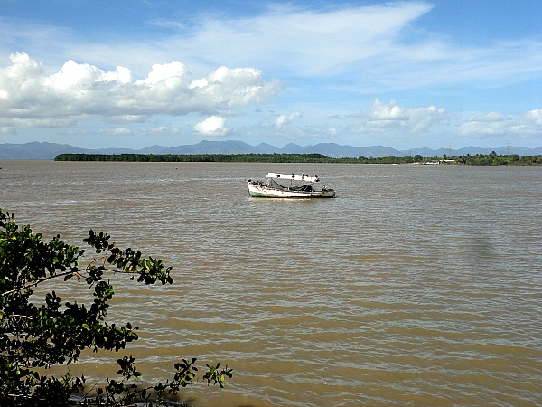 A floating dinghy in this Caribbean bay was shot from the Temple in the Sea in Trinidad & Tobago. There is a causeway that leads out to the temple with a 180 degree view of the beautiful sea. The view in this direction features this floating empty boat moored by anchor. The rugged mountain jungle of Trinidad sits in the background.