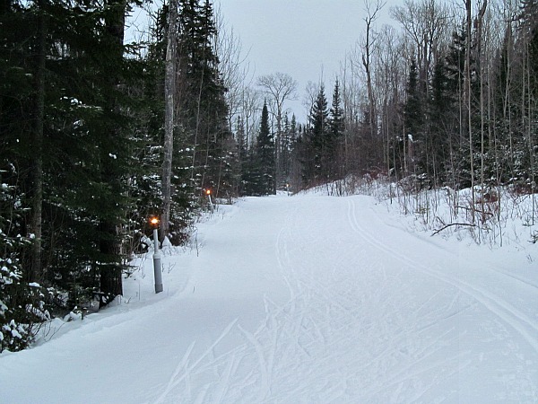 I love lighted skiing trails, and Pincushion Mountain has a good one. The West Overlook Trail and a portion of the East Overlook Trail near the beginning are lighted, so you have about 1.5 kilometers of lighted trails including the nice hill just down from the ski shop.