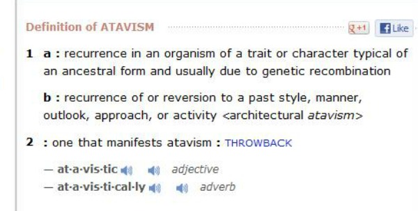 Scroll back up to the definition and you may not make the connection to my point. Atavism is not just a trait that skips one generation. It could be a trait that has skipped many generations or downright disappeared for centuries.