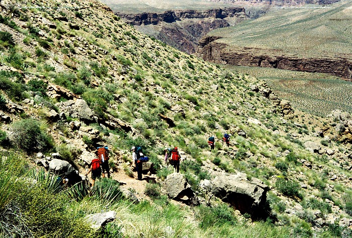 While backpacking down to the Colorado River in the Grand Canyon National Park, hikers go through ten different geologic strata. A good way of remembering these ten layers is by this phrase formed by the first letter in the acronym of the ten different strata: “Know The Canyon’s History, Study Rocks Made By Time”: Kaibab, Toroweap, Coconino, Hermit, Supai, Redwall, Muav, Bright Angel, Tapeats. Each one of these layers presents a different type of trail for the hiker. Some of the rock strata are steep while some are more manageable like this section of the trail.