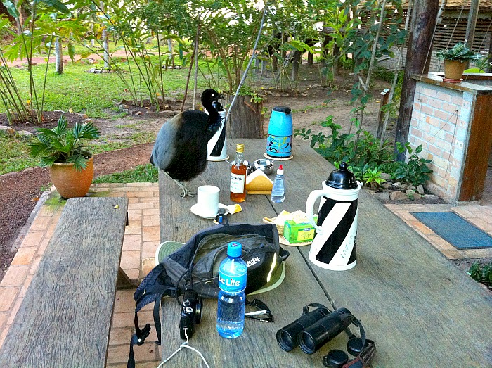 When you stop for a little break for afternoon tea in Guyana, you just never know who may stop by uninvited. Here at the Rock View Lodge in the Rupunini at Annai, we were joined by a grey-winged trumpeter for the English staple in the South American country of Guyana. These birds are actually wild, but obviously this one was quite tame as it actually came up and started lightly pecking my feet.