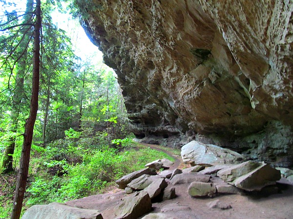 A Red River Gorge cliff trail is a common sight in the Daniel Boone National Forest where this picture of a hiking trail was taken. These geological structures are difficult to capture in the park without a wide angle lens as they tower over the camera and if you back away trees get in the way. The forest was incredibly lush as you can see with the deep green to the left thanks to recent torrential rains.