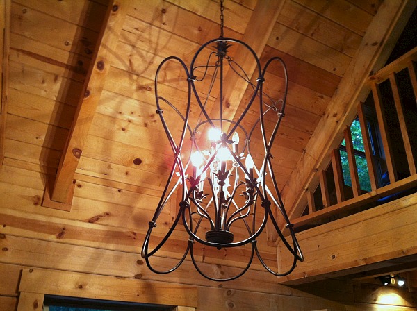Inside the cabin was even more spectacular. It had a huge open room in the front that was the kitchen, living, and dining room. A beautiful wooden staircase ascended up to the bedrooms. The cabin looked like a piece of art. The wood paneling was beautiful and the light fixtures were amazing.