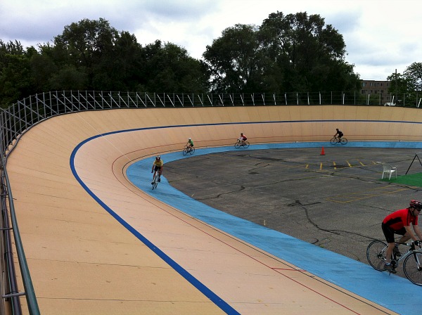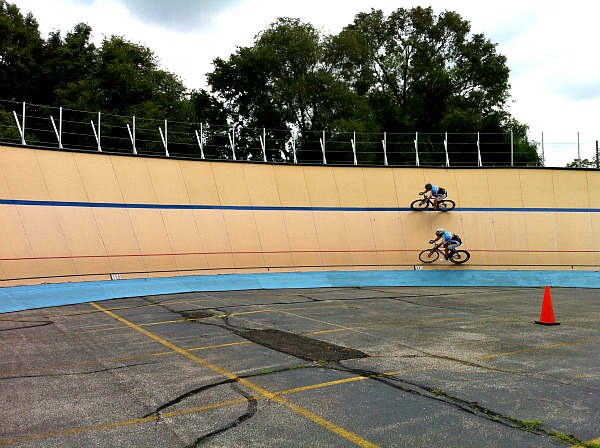 They had us do several drills over and over again to get us used to entering and departing the track and how to sit on the bike while riding the turns. You need to angle the bike away from the turn or you have the danger of hitting your pedal on the incline of the wall.