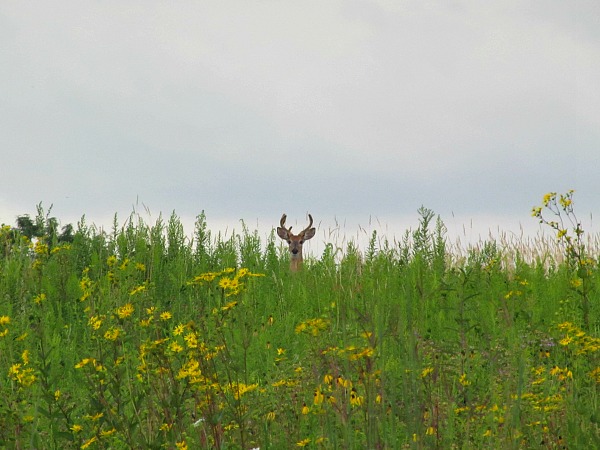 It can be difficult to spot wildlife in a tallgrass prairie in the summer as birds and animals have plenty of places to hide as the tallgrasses are almost jungle like in their impenetrability. On the way back I did spot two heads bobbing through the thick grasses. It turned out to be two white-tailed deer and this one was a male just growing antlers.