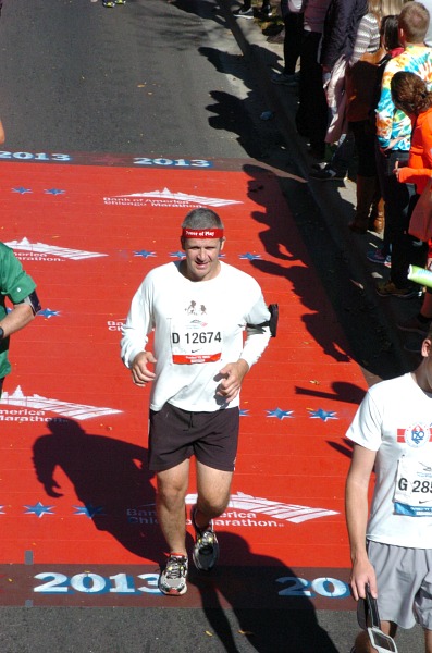 Soon I hit the 25 mile mark and then the mark for one mile to go. I hoped I could run one mile without stopping. A half mile later I started to walk again. I walked about a minute and began to run again. Soon there was the 800 meter left to go followed by the 400M, and 300M mark. We turned a corner off Michigan Avenue and went uphill for a stretch. Then the finish line was in sight and it was over. The official time over the finish line read over five hours, but I knew with the lag time I had gone under five hours.