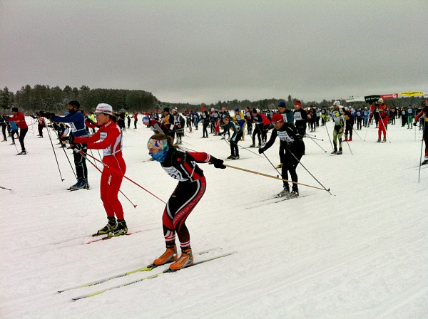 At the Birkie, the race is really packed until the point when the Korteloppet racers veer off on their own course about ten kilometers into the race. The start is especially tight. There are rarely times when you are not within sight of other racers and usually within a pack.