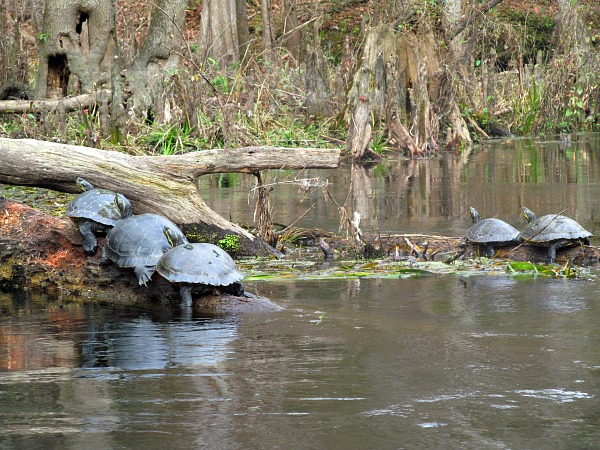 With any Florida stream, you can count on a wide array of birds, and the Ichetucknee did not disappoint. Black-crowned night herons crouched under stumps waiting for a crayfish or a minnow to come within striking distance of its deadly beak. Great-blue herons flew and squawked around every bend. Wood ducks scurried and bleated from under hiding spots near the shore. Coots gathered in bays while turtle conventions met on exposed dead trees waiting for quorem. We even saw remnants of the busy beaver at work with gnawed trees and even a home near the put in.